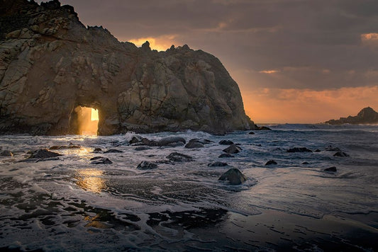 Usa-California Sunsets gleams through this hole in the rock along the Big Sur coast Black Ornate Wood Framed Art Print with Double Matting by Sederquist, Betty