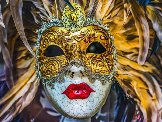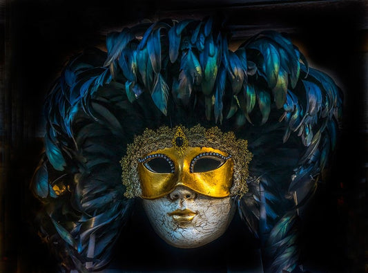 White golden Venetian mask feathers-Venice-Italy-Used since 1200s for Carnival-Also used for Mardi Black Ornate Wood Framed Art Print with Double Matting by Perry, William