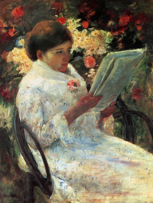 Woman Reading In A Garden 1880 Black Ornate Wood Framed Art Print with Double Matting by Cassatt, Mary