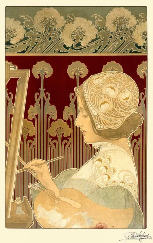 Woman Painting Black Ornate Wood Framed Art Print with Double Matting by Livemont, Privat