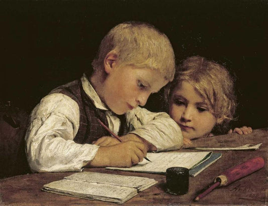 A Boy Writing Black Ornate Wood Framed Art Print with Double Matting by Anker, Albert