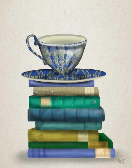 Teacup and Books Black Ornate Wood Framed Art Print with Double Matting by Fab Funky