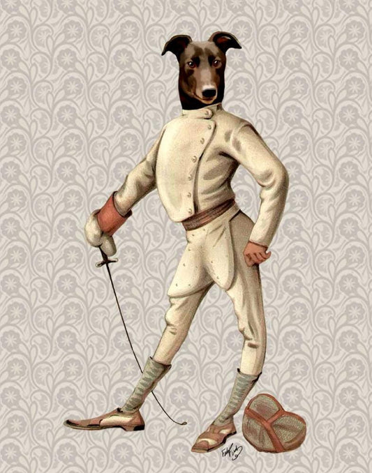 Greyhound Fencer in Cream Full Black Ornate Wood Framed Art Print with Double Matting by Fab Funky