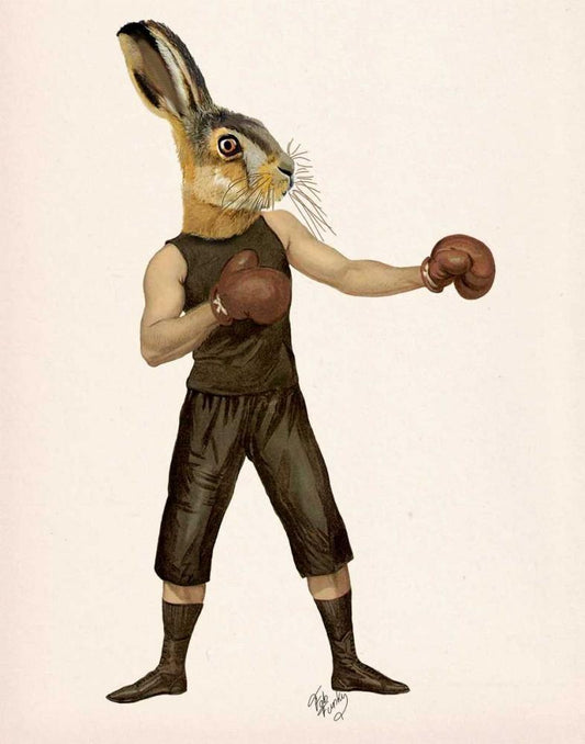 Boxing Hare Black Ornate Wood Framed Art Print with Double Matting by Fab Funky