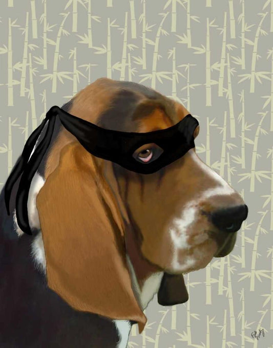 Ninja Basset Hound Dog Black Ornate Wood Framed Art Print with Double Matting by Fab Funky