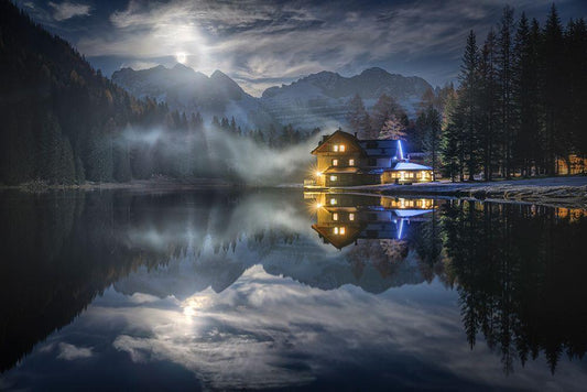 Cottage By The Lake White Modern Wood Framed Art Print with Double Matting by Krivec, Ales