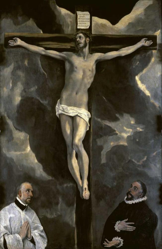 Christ on the Cross Adored by Two Donors White Modern Wood Framed Art Print with Double Matting by El Greco