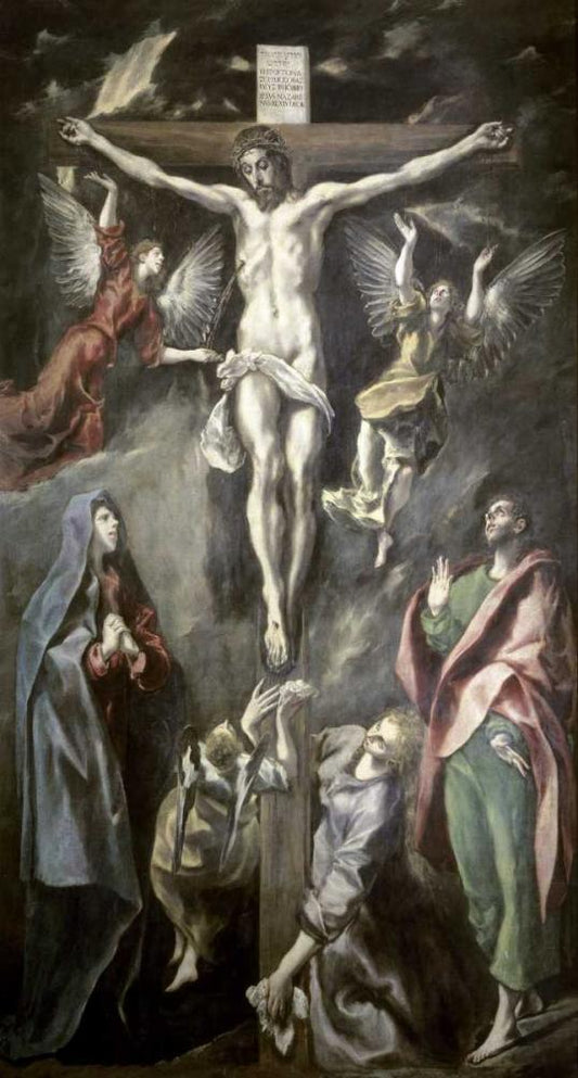Crucifixion With Virgin, Magdalene, St. John and Angels White Modern Wood Framed Art Print with Double Matting by El Greco