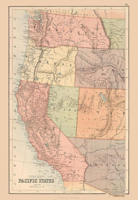 Pacific States of US - Black 1867 White Modern Wood Framed Art Print with Double Matting by Black