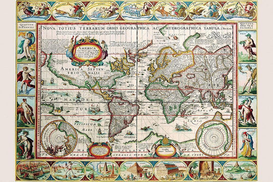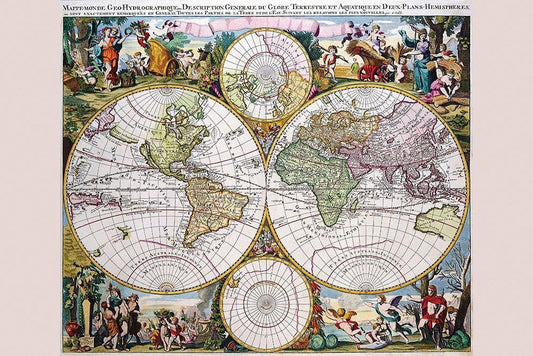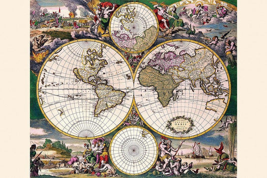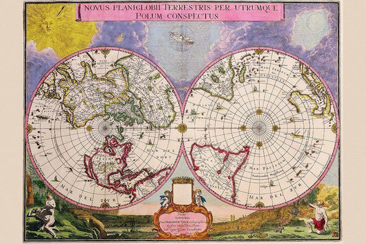 Stereographic Map of the World with Classical Illustration White Modern Wood Framed Art Print with Double Matting by Valk, Gerard