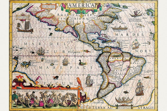 Map of the Americas White Modern Wood Framed Art Print with Double Matting by Van der Keere, Peter