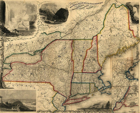 Railroad steam boat and stage route map of New England New York and Canada 1850 White Modern Wood Framed Art Print with Double Matting by Vintage Maps