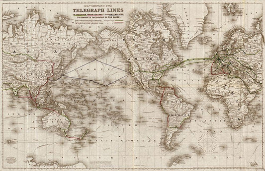 World Telegraph Lines 1871 White Modern Wood Framed Art Print with Double Matting by Vintage Maps