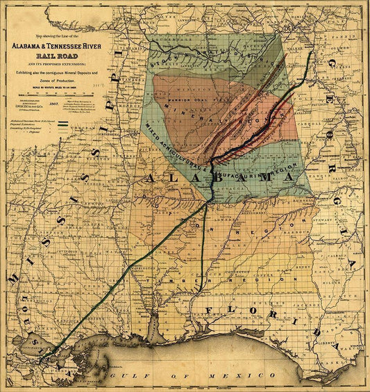 Alabama and Tennessee River Rail Road 1867 White Modern Wood Framed Art Print with Double Matting by Vintage Maps