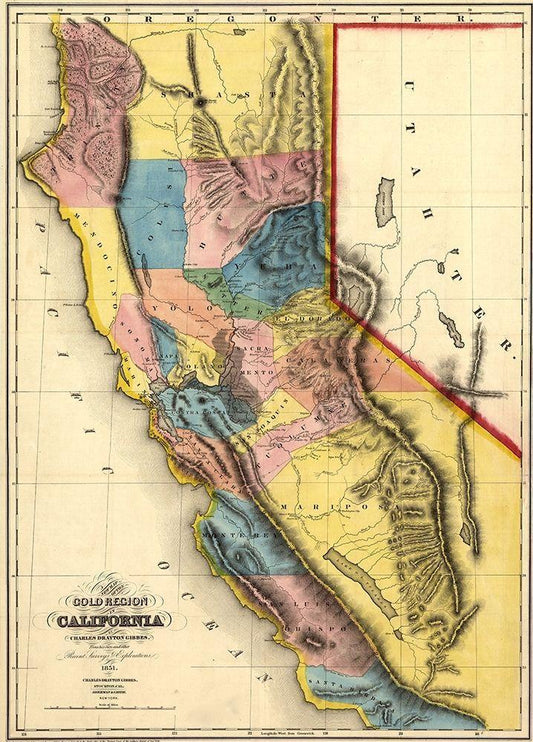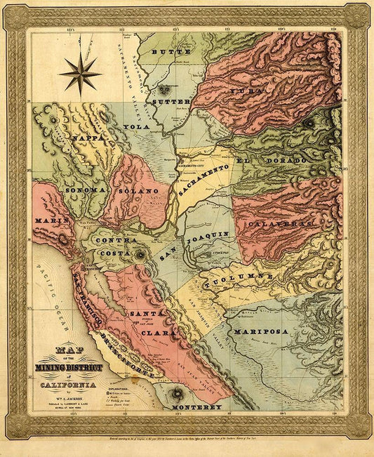 California Gold Fields 1851 White Modern Wood Framed Art Print with Double Matting by Vintage Maps