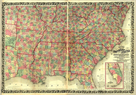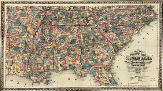 Railway and County Map of the Southern States White Modern Wood Framed Art Print with Double Matting by Vintage Maps