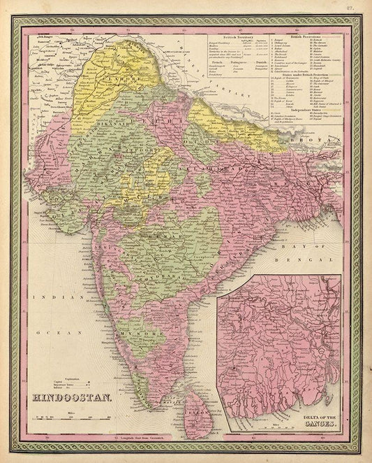 Hindustan 1849 White Modern Wood Framed Art Print with Double Matting by Vintage Maps