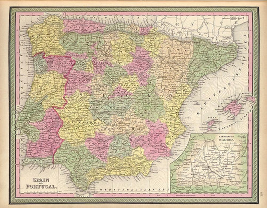 Spain and Portugal 1849 White Modern Wood Framed Art Print with Double Matting by Vintage Maps