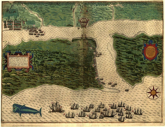 Sir Francis Drakes West Voyage to the West Indies Santo Domingo 1589 White Modern Wood Framed Art Print with Double Matting by Vintage Maps