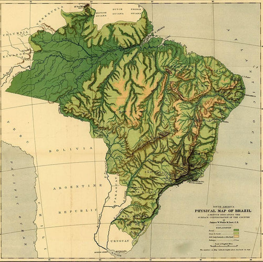 Physical Map of Brazil-the Amazon and Its tributaries 1886 White Modern Wood Framed Art Print with Double Matting by Vintage Maps