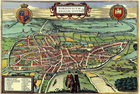 Norwich England White Modern Wood Framed Art Print with Double Matting by Hogenberg, Braun