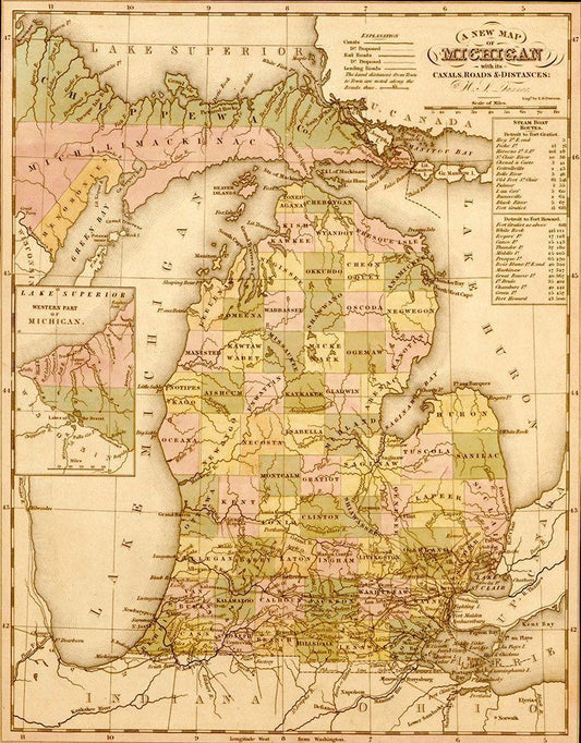 Michigan 1844 White Modern Wood Framed Art Print with Double Matting by Vintage Maps