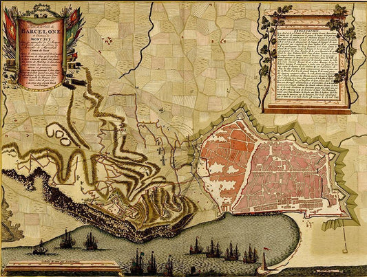 Barcelona Spain Defenses 1700 White Modern Wood Framed Art Print with Double Matting by Vintage Maps