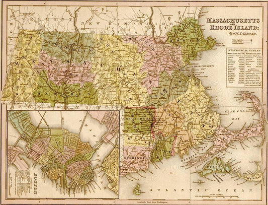 Massachusetts and Rhode Island 1844 White Modern Wood Framed Art Print with Double Matting by Vintage Maps