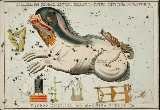 Astronomical chart illustration of the Psalterium Georgii-Fluvius Eridanus-Cetus-Officinal Scupltori White Modern Wood Framed Art Print with Double Matting by Hall, Sidney
