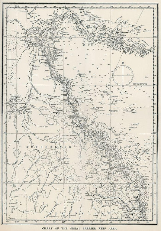 Chart of the Great Barrier Reef Area of Australia 1893 White Modern Wood Framed Art Print with Double Matting by Saville Kent, William