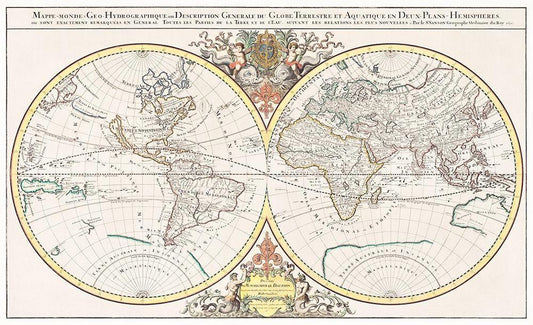 General description of the terrestrial and aquatic globe in two hemispherical planes 1691 White Modern Wood Framed Art Print with Double Matting by Jaillot, Alexis Hubert