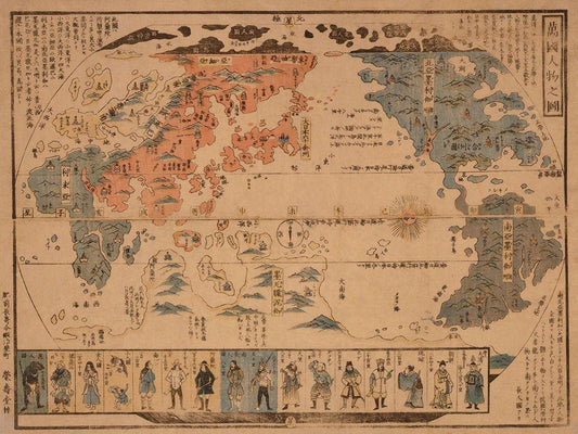 Japanese Map of the World; People of Many Nations White Modern Wood Framed Art Print with Double Matting by Unknown