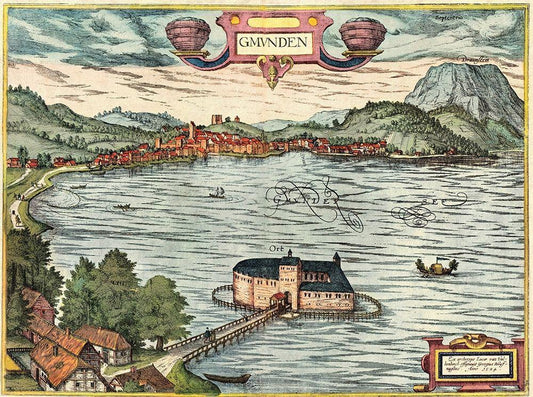 Gmunden Austria White Modern Wood Framed Art Print with Double Matting by Hogenberg, Braun