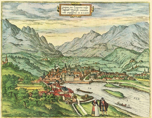 Innsbruck Austria Tyrol White Modern Wood Framed Art Print with Double Matting by Hogenberg, Braun