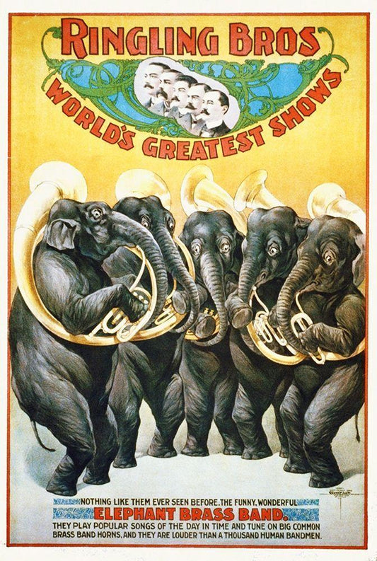 Ringling Bros - Worlds Greatest Shows - The Funny, Wonderful Elephant Brass Band - 1899 White Modern Wood Framed Art Print with Double Matting by Hollywood Photo Archive