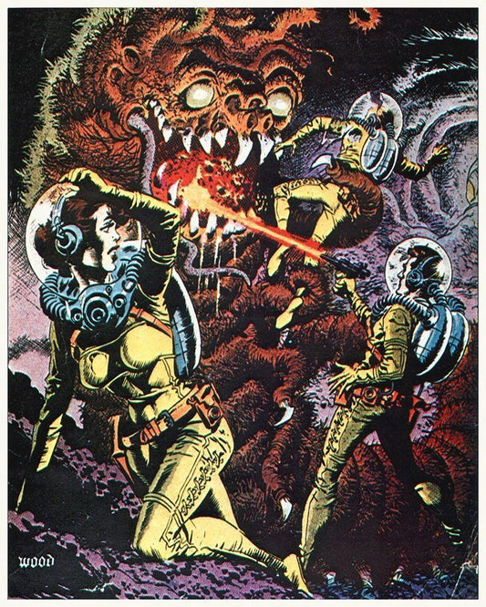 Space Explorers Battle a Beast - Preproduction Art By Wood, Unknown Film White Modern Wood Framed Art Print with Double Matting by Hollywood Photo Archive