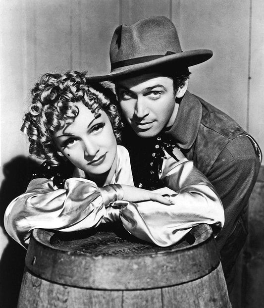 Destry Rides Again - Marlene Dietrich with James Stewart White Modern Wood Framed Art Print with Double Matting by Hollywood Photo Archive
