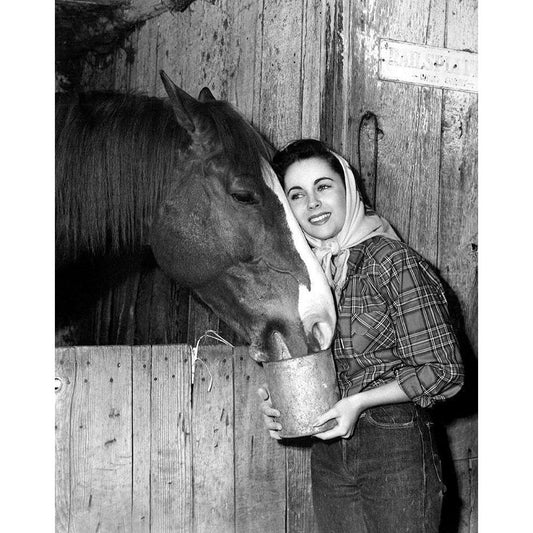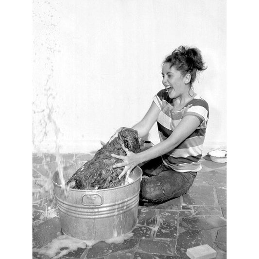 Elizabeth Taylor washing a dog Black Modern Wood Framed Art Print by Hollywood Photo Archive