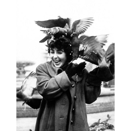 Elizabeth Taylor with pigeons Black Modern Wood Framed Art Print by Hollywood Photo Archive
