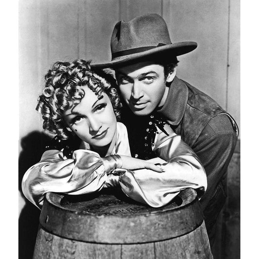 Destry Rides Again - Marlene Dietrich with James Stewart Black Modern Wood Framed Art Print by Hollywood Photo Archive