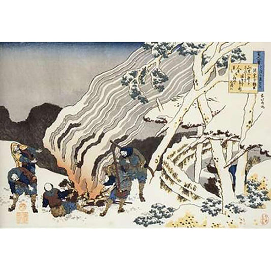 Hunters By A Fire In The Snow Black Modern Wood Framed Art Print with Double Matting by Hokusai