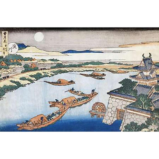 The Moon Above Yodo River And Osaka Castle Black Modern Wood Framed Art Print with Double Matting by Hokusai