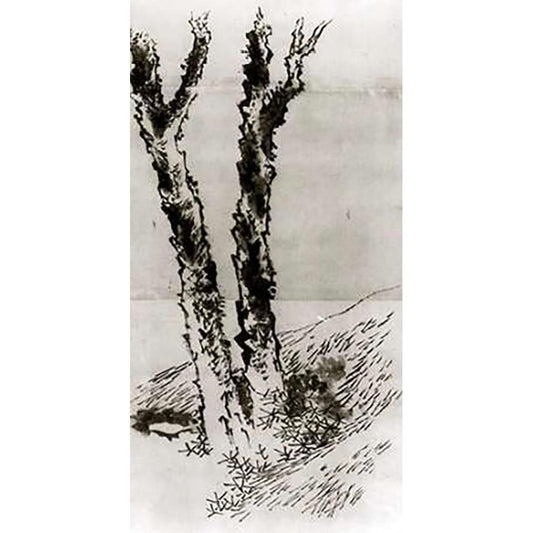 Two Trees 1830s Black Modern Wood Framed Art Print with Double Matting by Hokusai