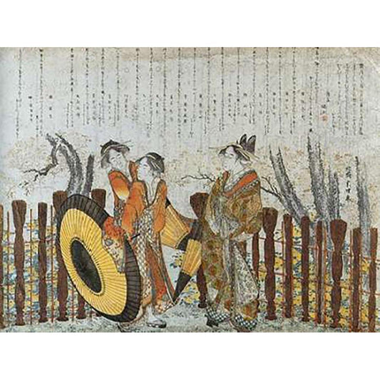 An Oiran And Maids By A Fence Black Modern Wood Framed Art Print with Double Matting by Hokusai