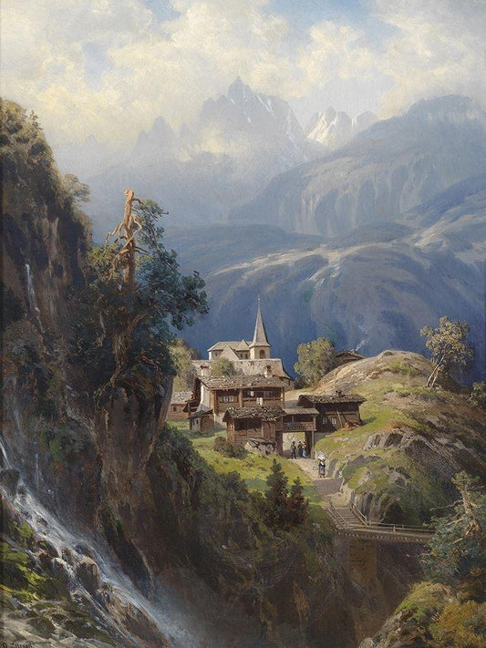 Village in the Bernese Alps White Modern Wood Framed Art Print with Double Matting by Mosengel, Adolf