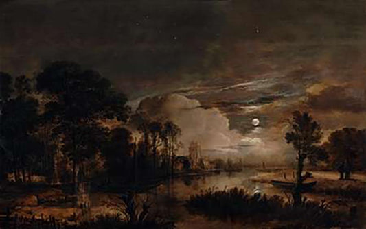 Moonlit Landscape with a View of the New Amstel River and Castle Kostverloren White Modern Wood Framed Art Print with Double Matting by Van Der Neer, Aert