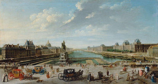 A View of Paris from the Pont Neuf White Modern Wood Framed Art Print with Double Matting by Raguenet, Jean-Baptiste