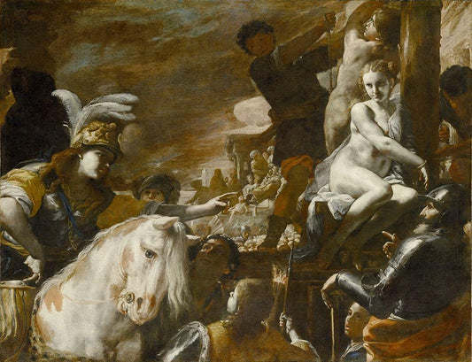Clorinda Rescuing Sofronia and Olindo White Modern Wood Framed Art Print with Double Matting by Preti, Mattia