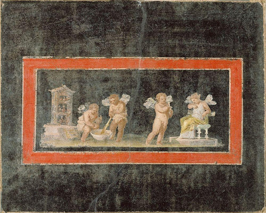 Fresco Fragment with Cupids and Psyche Making Perfume White Modern Wood Framed Art Print with Double Matting by Artisan, Unknown 1st Century Roman