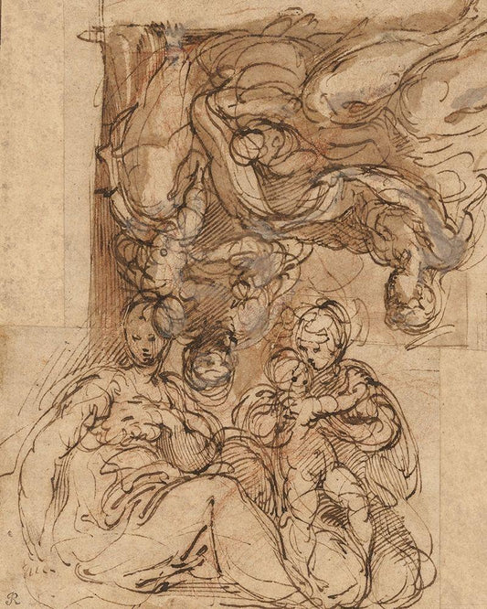 Two Studies for a Holy Family White Modern Wood Framed Art Print with Double Matting by Parmigianino